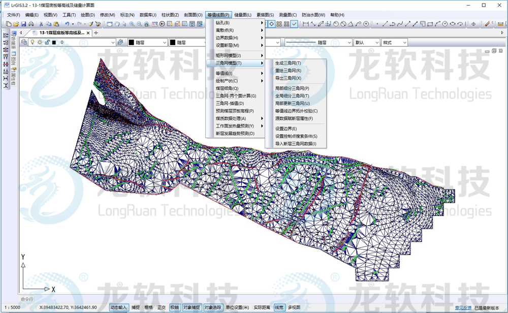 地測圖形協同管理系統主要包括地測數據庫管理、等值線圖、測量圖、儲量圖、柱狀圖、剖面圖、素描圖、防治水圖、瓦斯地質圖等模塊。該系統以先進的算法、精準的空間數據信息處理、高效的圖形處理流程,實現等值線圖、采掘工程平面圖、鉆孔柱狀圖、綜合柱狀圖、煤巖層對比圖、勘探線剖面圖、預想剖面圖、底板等高線及儲量估算圖、巷道素描圖等地測圖件的繪制與管理,是礦井相關專業制圖的基礎。