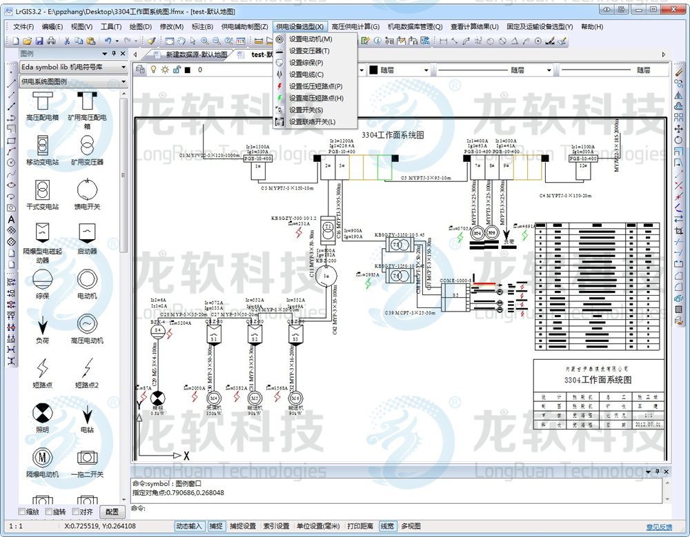 供電設計圖形協同管理系統包括機電圖形協同管理、供電設備選型計算和固定設備選型計算等模塊。機電圖形協同管理是基于一張圖管理模式,以在線協同的方式設計運輸系統圖、設備布置圖、供排水系統圖、通訊聯絡系統圖、人員定位系統圖、供電系統圖等機電圖形。供電設備選型計算是基于標準的供電設備圖例庫繪制供電系統圖,對電動機、變壓器、電纜、各類開關進行相應的供電計算與校驗,從設備參數數據庫選出合適的供電設備,并自動生成供電設計報告。固定設備選型計算是對輔助運輸巷絞車、運輸機、排水等設備進行選型計算,選出合適的設備,生成相應的設備選型設計報告。