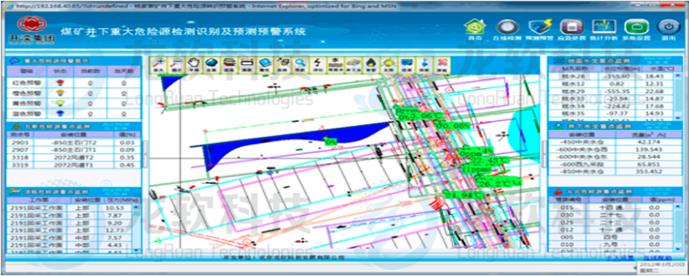 基于煤礦水、火、瓦斯和頂板等安全監控系統,實現重大危險源在線檢測,實時采集重大危險源數據,建立重大危險源指標體系庫,運用先進的預警模型,實現對煤礦井下水、火、瓦斯和頂板等重大危險源的集成管理和超前預警。提高煤礦重大危險源預警能力,降低重大危險源事故發生率,進而提高煤礦整體安全管理水平。